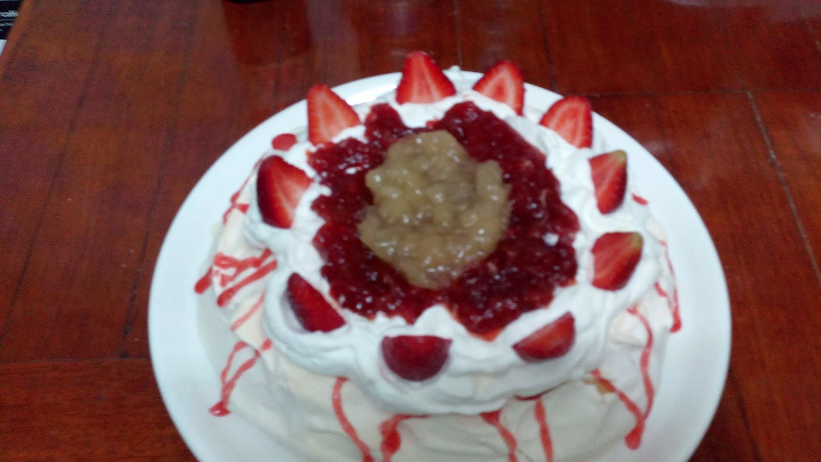 OBS: eu à pouco referenciei que deveriam enfeitar momentos antes da hora de servir, o que me aconteceu foi que passado cerca de 15 minutos a pavlova começou a abrir pois tinha colocado muito "peso".